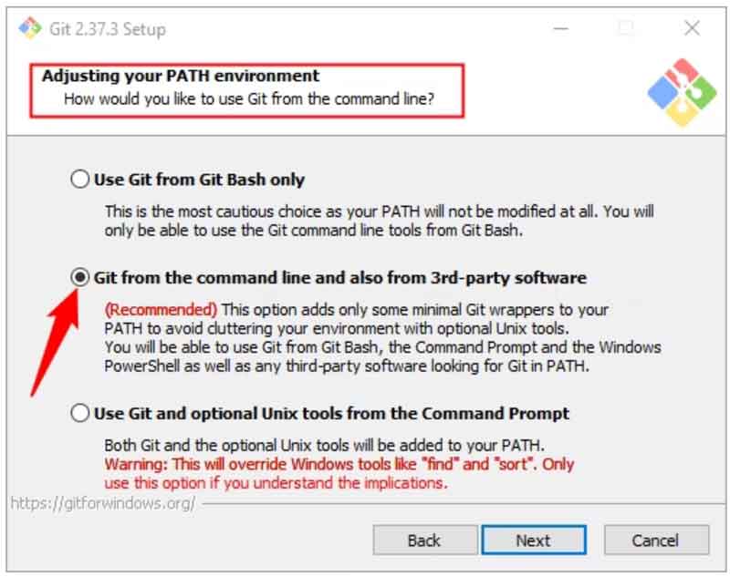 A continuación, vaya al sitio web de Git (https://git-scm.com/download/win), descargue la configuración correcta y siga las instrucciones en pantalla para instalarla en su PC. Asegúrate de seleccionar Git desde la línea de comandos y también desde software de terceros cuando ajustando el entorno de su camino.