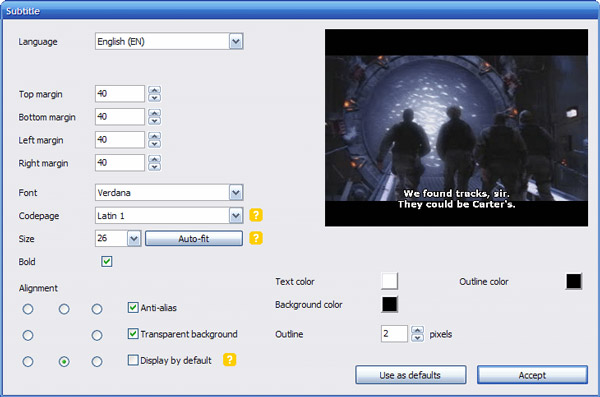 Vaya a la pestaña "Subtítulos" y haga clic en el botón "Agregar" para agregar archivos de subtítulos al título. Para editar el idioma, la fuente, el tamaño de fuente y el posicionamiento de un subtítulo, selecciónelo y presione el botón Editar.