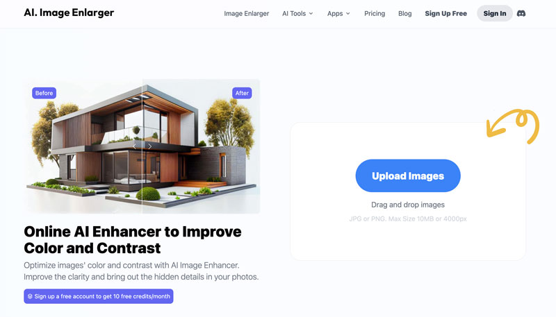 AI. Image Enlarger is a popular photo enhancement tool that can help you optimize color and contrast. It uses AI technology to bring out the hidden details and increase clarity. It offers a 100% automatic way to enlarge images and enhance quality. The free plan comes with file size and resolution limits. What’s more, the free account only allows you to edit 10 images in one month.
