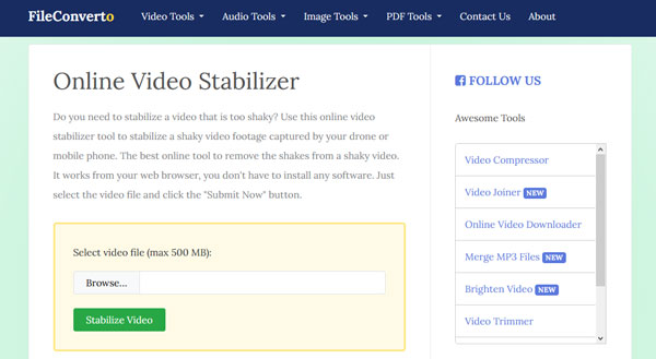 FileConverto proporciona una herramienta estabilizadora de video en línea para estabilizar sus secuencias de video inestables capturadas por un teléfono móvil. Lo que debe hacer es hacer clic en el botón Examinar para cargar el video y hacer clic en Estabilizar video para iniciar la estabilización del video.