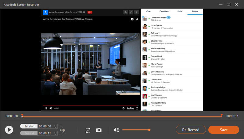Para la grabación del seminario web Livestorm, puede utilizar la función Responder mencionada anteriormente. Debido a sus propias limitaciones, una herramienta profesional de grabación de seminarios web en vivo es esencial para futuras revisiones. Aissesoft Screen Recorder es la mejor grabadora de seminarios web en vivo para capturar cualquier seminario web o reuniones de video con una calidad súper alta. Puede grabar seminarios web o videoconferencias de Livestorm con audio desde la computadora y su micrófono.